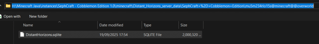 Then navigate into the folders minecraft/Distant_Horizons_server_data/SephCraft+%2D+Cobblemon+Edition/mu5m234rlo15s@minecraft@@overworld and delete the files, and replace them with the file you downloaded, it should look like this: